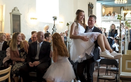 Ved infoaftenen 1 måned før konfirmationerne for forældre og konfirmander, bad jeg til sidst konfirmanderne om at gå udenfor kirken – og så fortalte jeg forældrene, at jeg pønsede på, at lave en sådan ”happening” og at de i hver familie UDEN at sige noget til konfirmanderne, skulle finde en eller to i familien, der ville/kunne bære konfirmanden op til alteret.